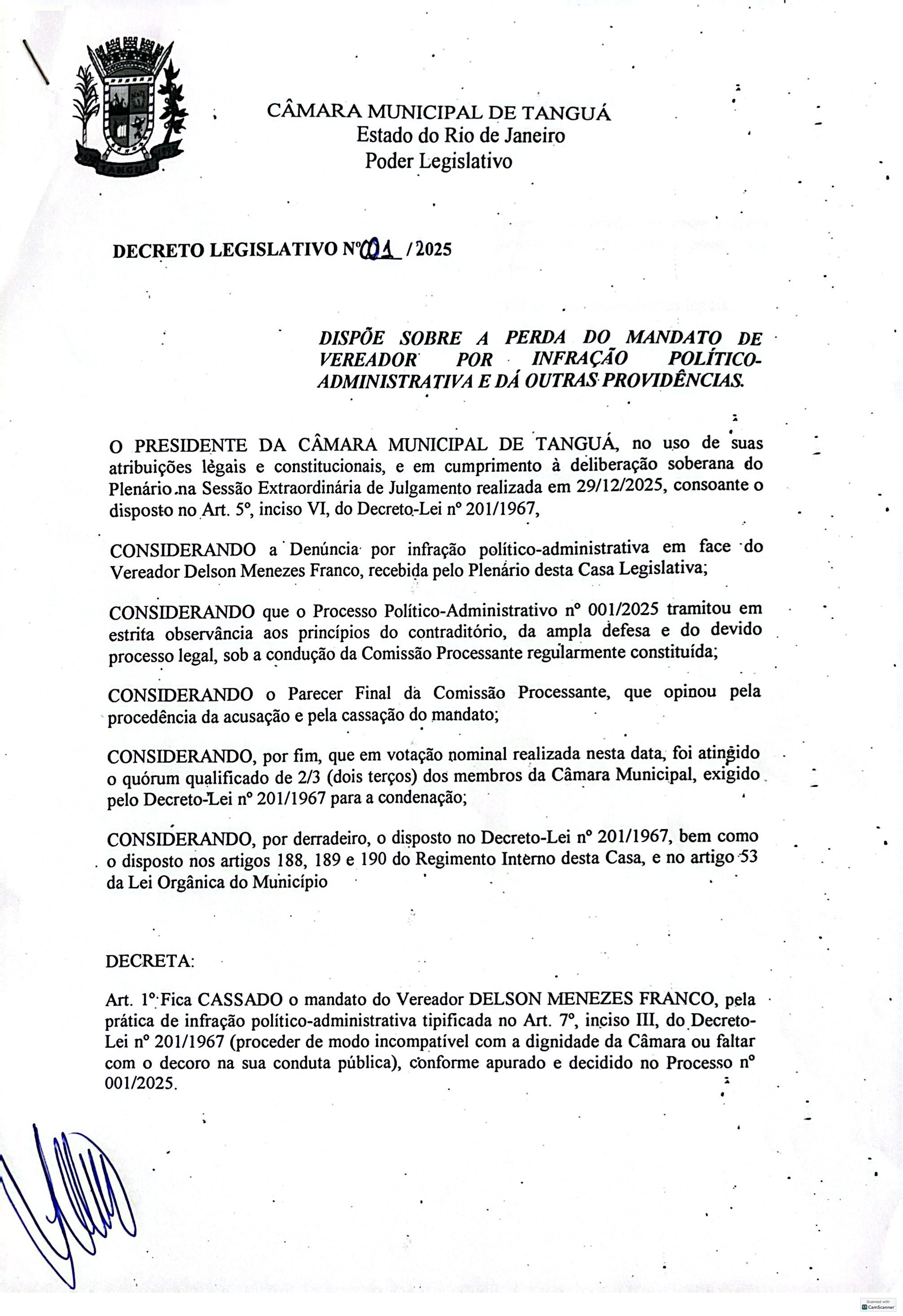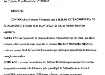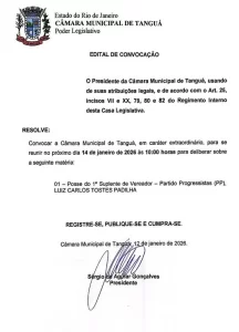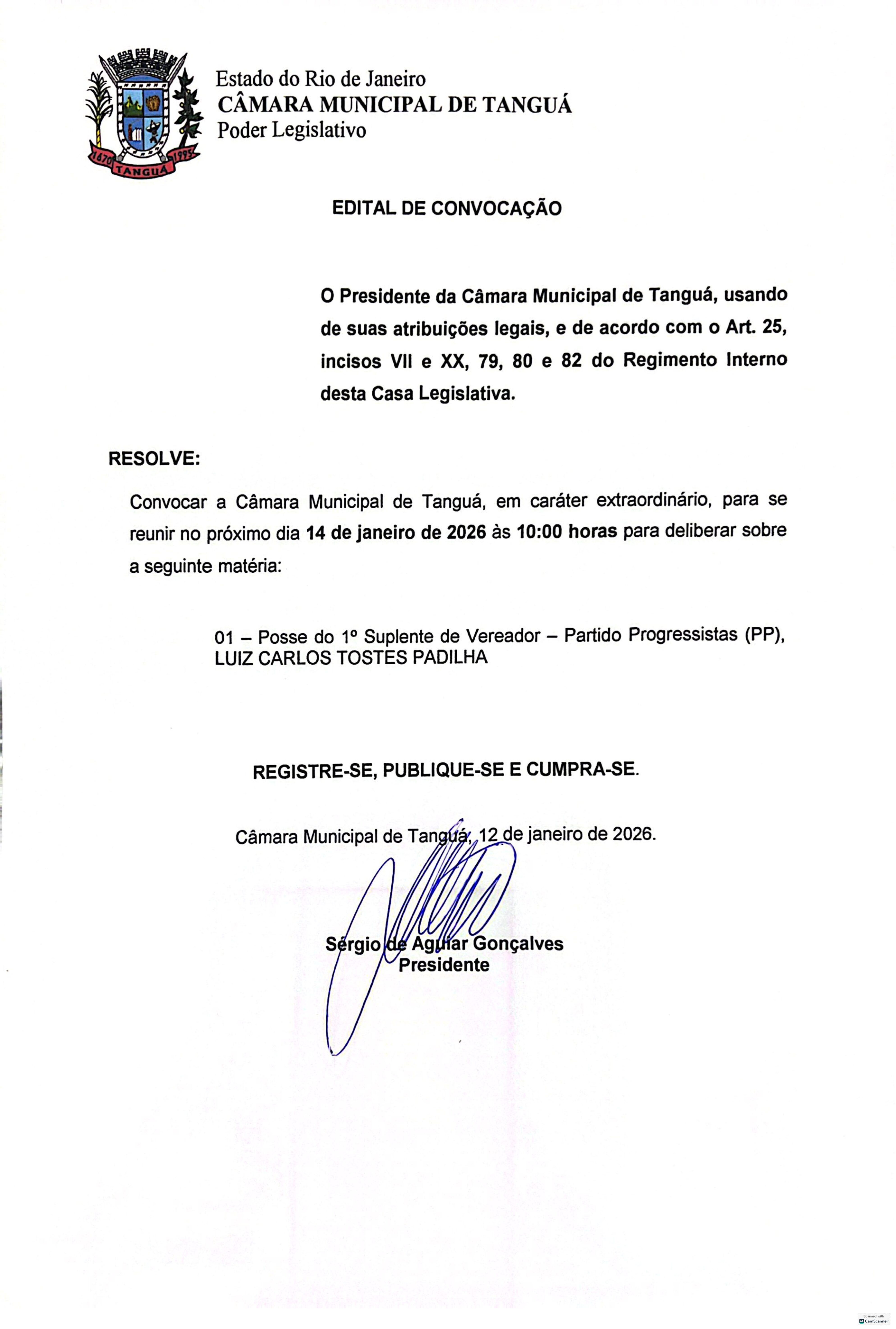 Convocar a Câmara Municipal de Tanguá, em caráter extraordinário, para se reunir no próximo dia 14 de janeiro de 2026 às 10:00 horas para deliberar sobre a seguinte matéria:
